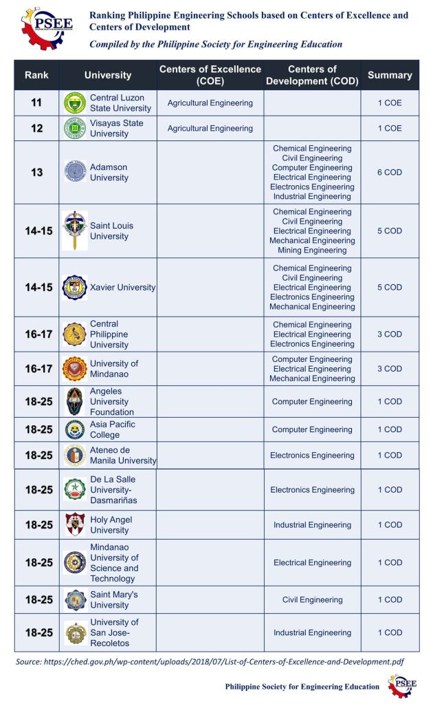 PSEE June 2021 University Ranking is based on the number of Center of Excellence (COE) and Center of Development (COD) in various engineering programs of all Universities and Colleges in the Philippines.
